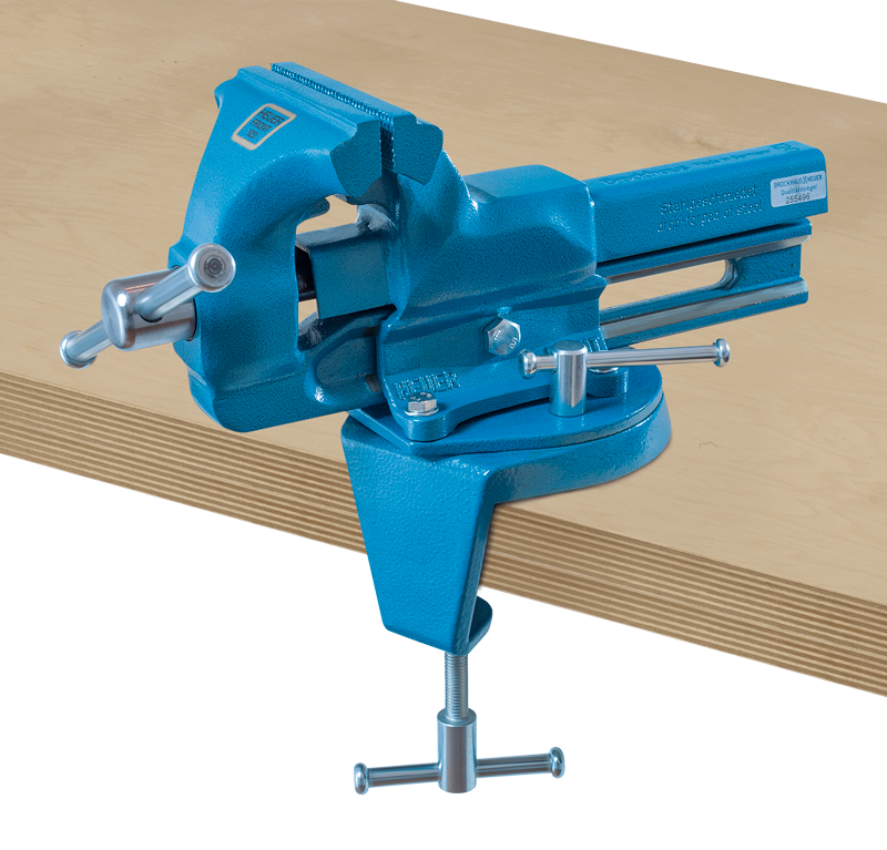 On the other hand the HEUER table clamp, to fix the vice flexibly to any worktop up to 60 mm thick – quickly, without damage or drilling holes. This creates space on the worktop and avoids complicated and time-consuming mounting and dismantling of the whole vice on the workbench.